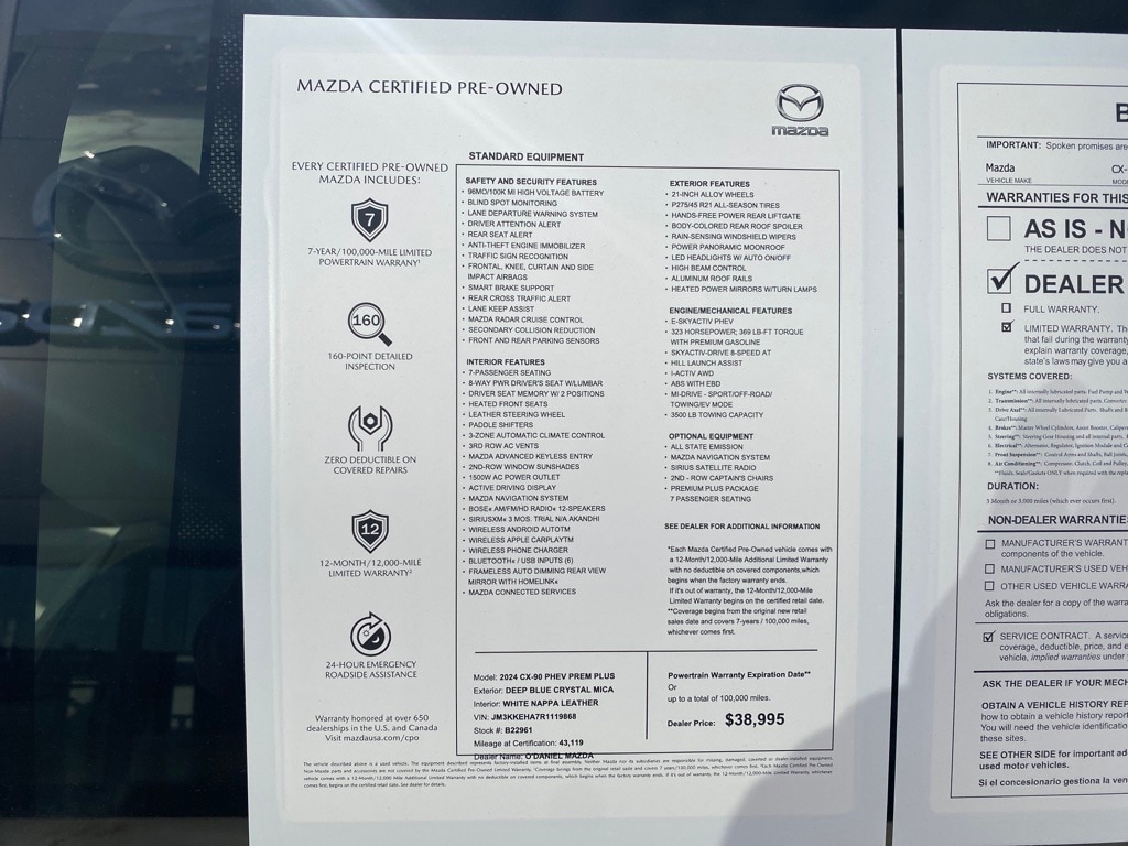 Apple CarPlay / Android Auto, 1 Owner, Certified Pre Owned, CX-90 PHEV Premium Plus, AWD, Auto High-beam Headlights, Heads-Up Display, Heated rear seats, Heated steering wheel, Heated/Ventilated Front Bucket Seats, Memory seat, Nappa Leather Seat Trim, Power driver seat, Power Liftgate, Power moonroof, Rain sensing wipers, Wheels: 21" x 9.5J Aluminum Alloy.