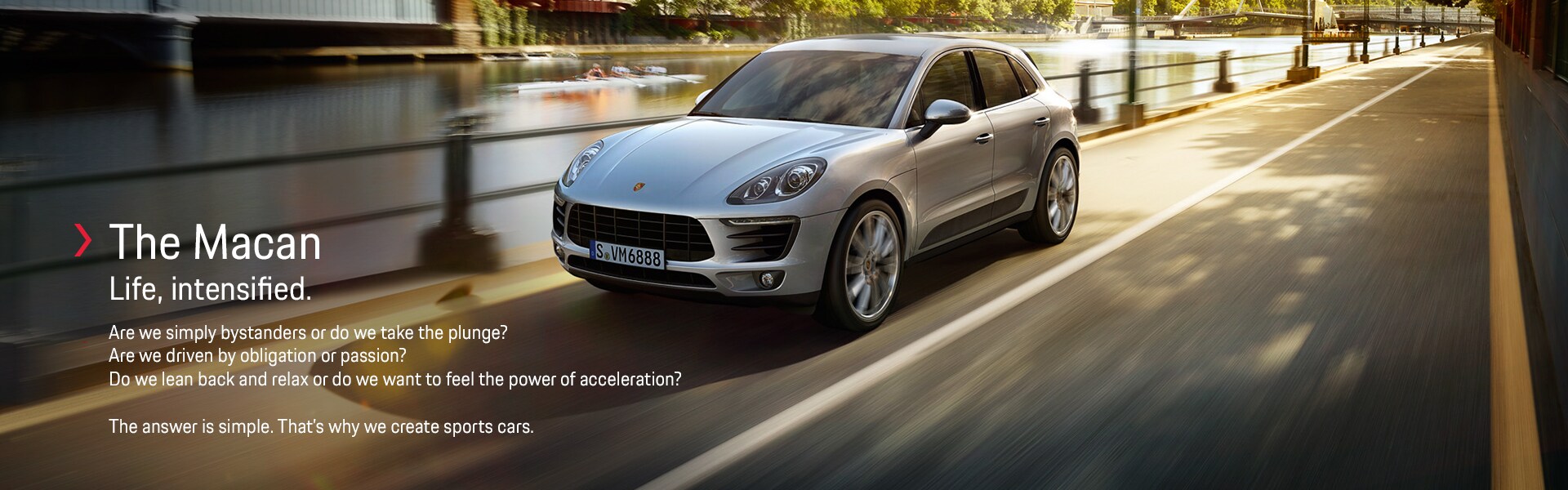 Those who prefer to blaze a trail of their own don't need to follow the lead of others. We're thinking specifically about cars known as compact SUVs, characterized by five doors, five seats, all-wheel drive and, of course, a higher sitting position. But aren't they lacking a certain something? Something that adds a little life, lets us enjoy a more intimate relationship with the road and delivers great driving pleasure. A concept that boasts plenty of space for hobbies, leisure and sport. But no room for compromise. Compact, concentrated and intensive, but still powerful. Practical, but never ordinary. It is by these standards that we created the Macan, and saw it emerge with four distinct guises. Each one a sports car. Each one unmistakable in its own segment. Each one a genuine Porsche-from design and driving dynamics to equipment specification. From our dynamic entrylevel model to the ultra sporty S variant and the striking GTS model to the Turbo, which sets performance standards in its vehicle class. All Macan models were developed, tested and built in keeping with the Porsche philosophy. That's where we take sporty style and performance from the racetrack and inject them into everyday driving. We make the Macan as efficient as possible-and of course, comfortable. No efforts were spared. Our engineers achieved their development objective: the first sports car among compact SUVs. The Macan-built for an intensive life in which the thirst for experience and thrills are ever present, and in which new challenges are a permanent driving force. Built for a life that refuses to be cut-short by conventions and feels all the more authentic for it. Direct and intimate. A sports car that gives us what we're looking for, even in our everyday life: that feeling of being alive.