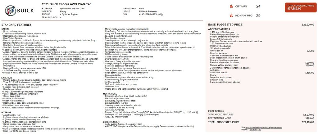 The 2021 Buick Encore Preferred is equipped with a wealth of premium features that elevate your driving experience. Enjoy the convenience of the Remote Vehicle Starter System, the added protection of the Premium All-Weather Floor Liners, and the security of the Wheel Lock Kit. Stay connected with the 7-inch Buick Infotainment System, complete with Apple CarPlay and Android Auto integration.