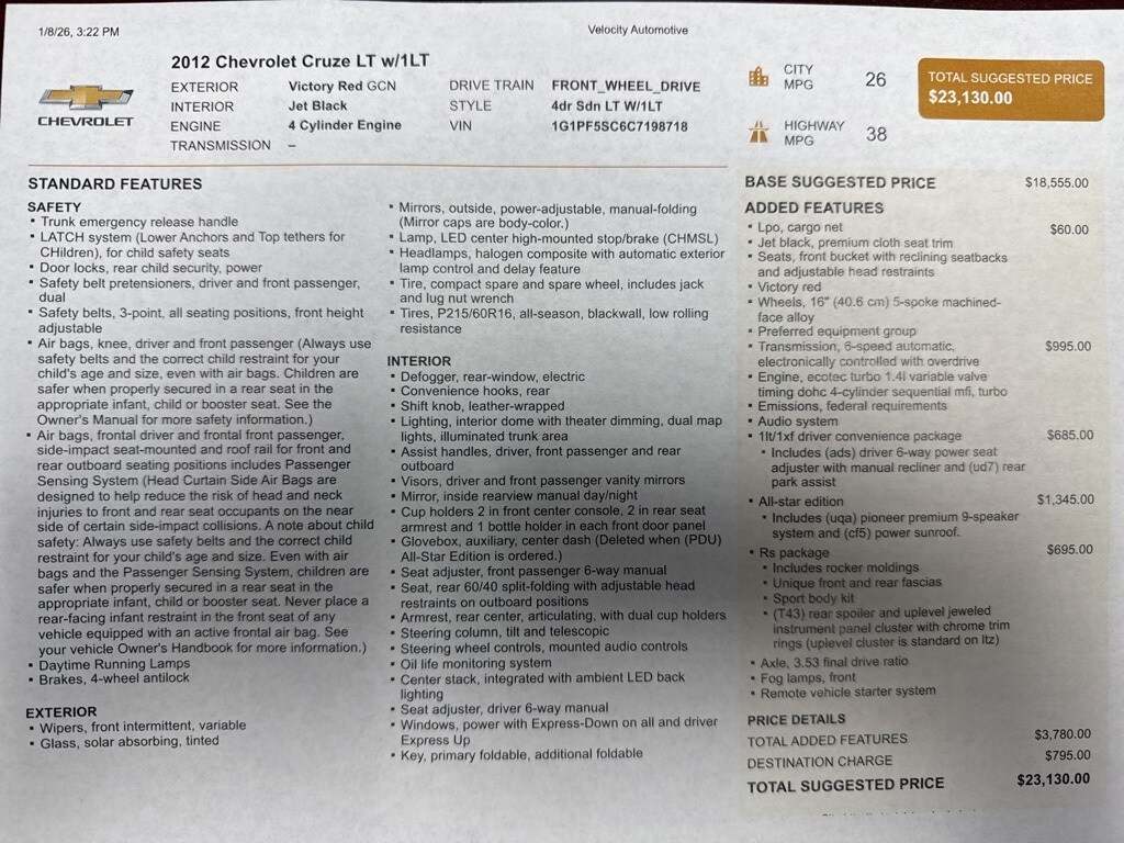 2012 Chevrolet Cruze 1LT Victory Red FWD ECOTEC 1.4L I4 DOHC VVT Turbocharged