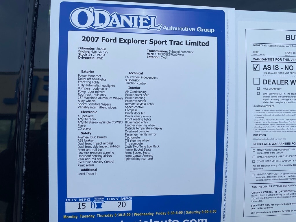 Local Trade in, Explorer Sport Trac Limited, 4.0L V6 12V, 4WD, 18" Machined Aluminum Wheels, Power driver seat, Power Moonroof.