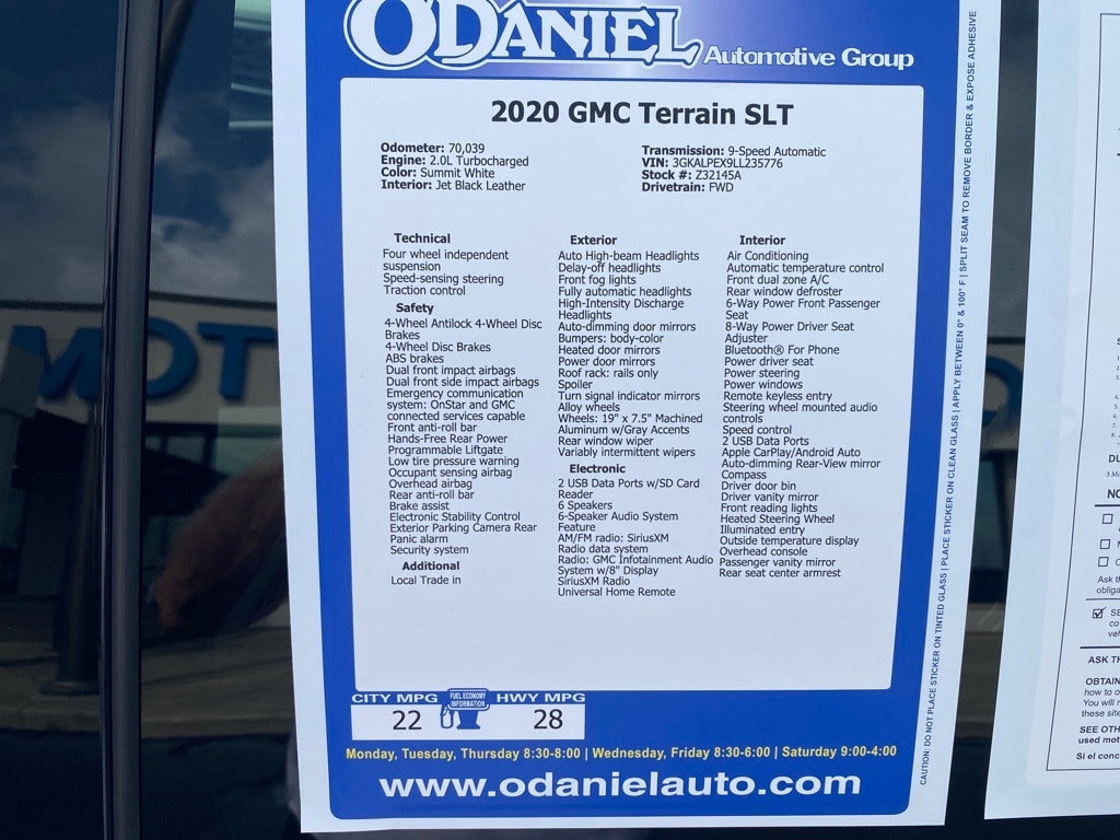 Local Trade in, Terrain SLT, 6-Way Power Front Passenger Seat, 8-Way Power Driver Seat Adjuster, Apple CarPlay/Android Auto, Auto High-beam Headlights, Exterior Parking Camera Rear, Hands-Free Rear Power Programmable Liftgate, Heated front seats, Heated Steering Wheel, Memory Package, Perforated Leather-Appointed Seat Trim, Preferred Equipment Group 4SA, Preferred Package, Universal Home Remote, Wheels: 19" x 7.5" Machined Aluminum w/Gray Accents.