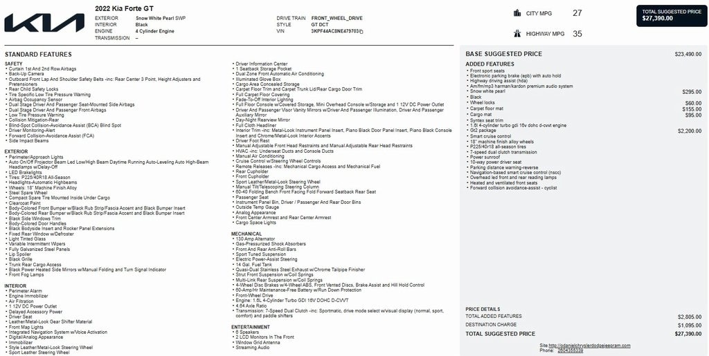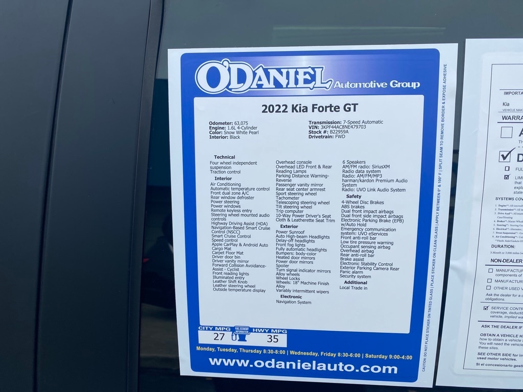 Local Trade in, Forte GT, 10-Way Power Driver's Seat, Apple CarPlay & Android Auto, Auto High-beam Headlights, Electronic Parking Brake (EPB) w/Auto Hold, Exterior Parking Camera Rear, Forward Collision Avoidance-Assist - Cyclist, GT2 Package, Heated & Ventilated Front Seats, Highway Driving Assist (HDA), Navigation System, Navigation-Based Smart Cruise Control (NSCC), Overhead LED Front & Rear Reading Lamps, Parking Distance Warning-Reverse, Power Sunroof, Radio: AM/FM/MP3 harman/kardon Premium Audio System, Smart Cruise Control, SynTex Seat Trim, Wheels: 18" Machine Finish Alloy.