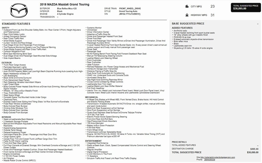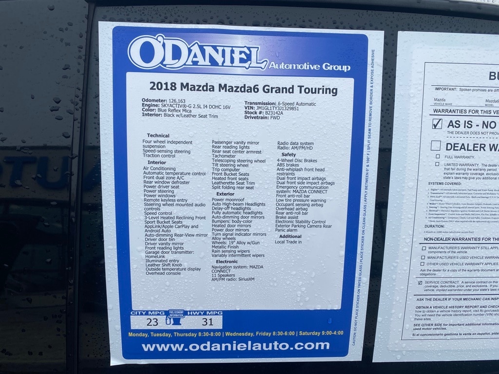 Local Trade in, Mazda6 Grand Touring, AppLink/Apple CarPlay and Android Auto, Auto High-beam Headlights, Automatic temperature control, Exterior Parking Camera Rear, Heated front seats, Leatherette Seat Trim, Navigation system: MAZDA CONNECT, Power driver seat, Power moonroof, Rain sensing wipers, Wheels: 19" Alloy w/Gun Metallic Finish.