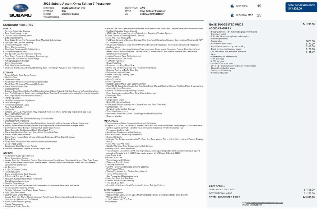 1 Owner, Ascent Onyx Edition, AWD, Auto High-beam Headlights, Exterior Parking Camera Rear, Heated Front Bucket Seats, Heated steering wheel, Power driver seat, Power Liftgate, Power moonroof, STARLINK/Apple CarPlay/Android Auto, StarTex Upholstery, Wheels: 20" x 7.5 J Aluminum Alloy w/Black Finish.