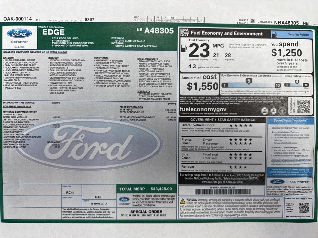 2022 Ford Edge SEL Blue Metallic AWD EcoBoost 2.0L I4 GTDi DOHC Turbocharged VCT