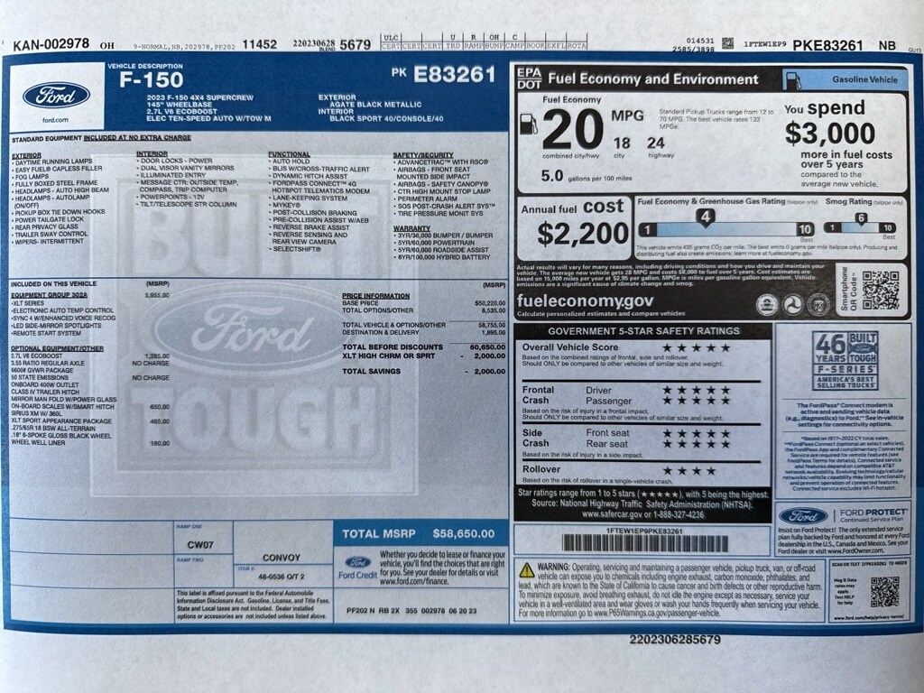 Extra Clean!, One Owner!, F-150 XLT, 4D SuperCrew, 2.7L V6 EcoBoost, 10-Speed Automatic, 4WD, Agate Black Metallic, Black Cloth, 10-Way Power Driver & Passenger Seats, 2-Bar Style Grille w/Chrome 2 Minor Bars, 8" Productivity Screen in Instrument Cluster, Accent-Color Step Bars, Auto-Dimming Rear-View Mirror, Black 2-Bar Style Grille w/Black Surround/Accents, Body-Color Door & Tailgate Handles, Body-Color Front & Rear Bumpers, Box Side Decals, Bright Polished Step Bars, Chrome Door & Tailgate Handles w/Body-Color Bezel, Chrome Single-Tip Exhaust, Class IV Trailer Hitch Receiver, Dual Zone Electronic Automatic Temperature Control, Equipment Group 302A High, GVWR: 6,470 lbs Payload Package, Heated Front Seats, Intelligent Access w/Push Button Start, LED Reflector Headlamps, LED Sideview Mirror Spotlights, Onboard 400W Outlet, Power Glass Heated Sideview Mirrors, Radio: AM/FM SiriusXM w/360L, Rear Under-Seat Storage, Remote Start System w/Remote Tailgate Release, SecuriCode Drivers Side Keyless-Entry Keypad, SYNC 4 w/Enhanced Voice Recognition, Unique Sport Cloth 40/Console/40 Front-Seats, Wheels: 18" 6-Spoke Machined Aluminum, Wheels: 18" Chrome-Like PVD, Wrapped Steering Wheel, XLT Chrome Appearance Package, XLT Sport Appearance Package, Zone Lighting.