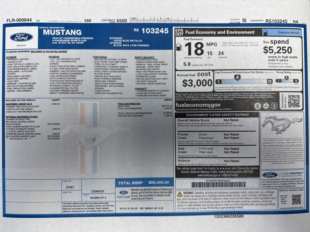 Extra Clean!, Local Trade, One Owner!, Mustang GT Premium, 2D Convertible, 5.0L V8 Ti-VCT, 10-Speed Automatic, RWD, Vapor Blue Metallic, Black Onyx Leather, Active Anti-Theft System, B&O Sound System by Bang & Olufsen, Connected Built-In Navigation, Equipment Group 401A High Package, Ford Co-Pilot360 Assist+, Illuminated Door-Sill Scuff Plates, Integrated Turn Signals, Leather-Trimmed Bucket Seats w/Color Accents, Locking Center Console, Memory Driver Seat & Mirrors, Pre-Collision Assist w/Automatic Emergency Braking, Security Package, Wheel Locking Kit.